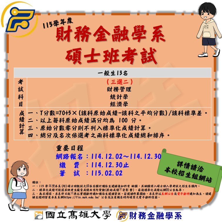 請遞補生隨時留意本系系網https://fin.nuk.edu.tw/ 公告及注意報名時所填寫之電子郵件信箱。